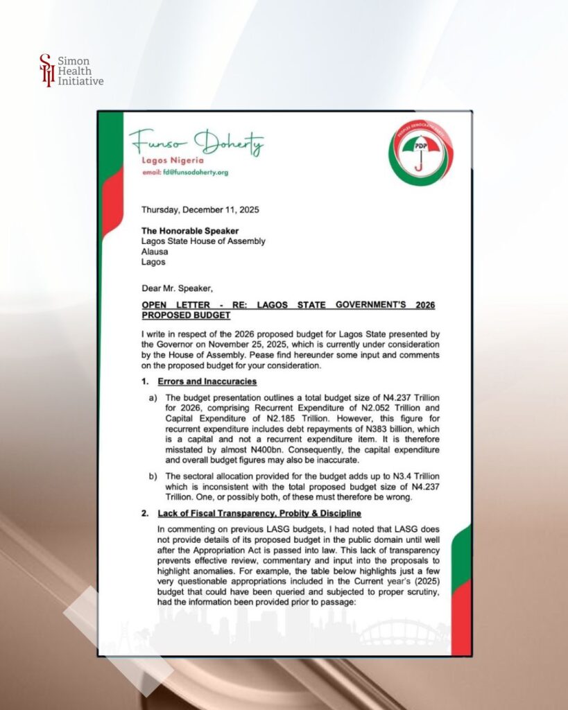 This section of the infographic showcases an open letter addressing the proposed 2026 Lagos State Budget. The letter highlights significant errors and inaccuracies in the budget presentation, including discrepancies in the total budget figures and sectoral allocations. Funso Doherty, the writer, points out the misclassification of funds (e.g., mislabeling capital as recurrent expenditure) and the lack of fiscal transparency and accountability in the budget process. This highlights the need for a thorough review and greater transparency to ensure proper allocation of resources, particularly in crucial areas like healthcare.
