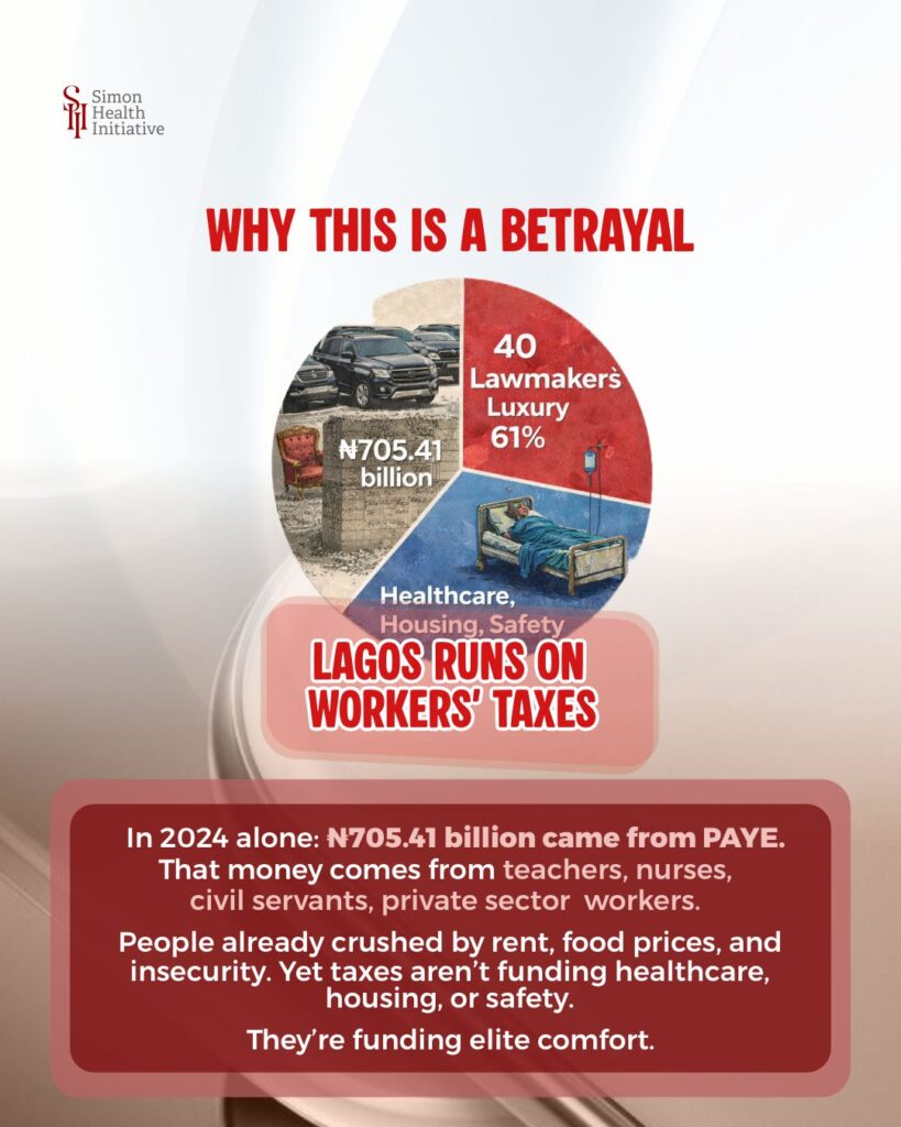 This infographic points out the stark contrast in government spending priorities, showcasing how workers’ taxes are being misallocated. In 2024 alone, ₦705.41 billion came from PAYE (Pay As You Earn) taxes, contributed by teachers, nurses, civil servants, and private-sector workers. While these individuals are already struggling with rising rent, food prices, and insecurity, the taxes they pay are not being used to fund essential services like healthcare, housing, or safety. Instead, the money is being used to fund luxury perks for 40 lawmakers, making it a betrayal of public trust.